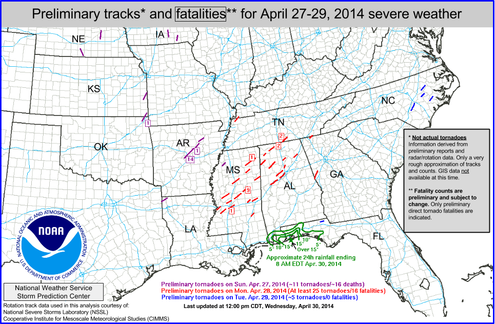 32 people were killed during the three-day severe weather event. Tornadoes of note include the Mayflower-Vilonia, Arkansas tornado on Sunday evening, which has the preliminary rating of EF-3 and it killed 14 people, and the Louisville, Mississippi EF-4, which killed 9 people.